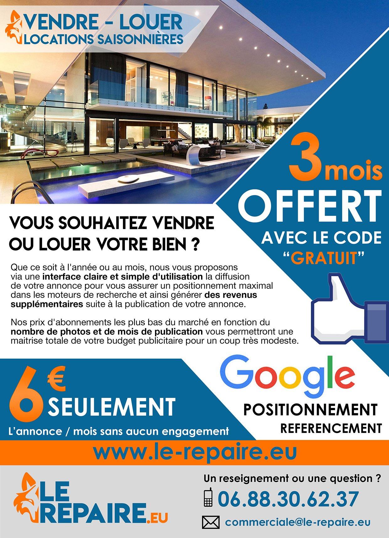 Vous souhaitez vendre ou louer votre bien rapidement ? Alors n'hésitez plus ! Rendez-vous sur le site du Repaire pour vous assurer un positionnement optimal de votre annonce dans les moteurs de recherche.
